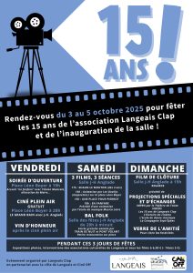 La salle de cinéma Jean-Hugues Anglade et l'association Langeais Clap soufflent leurs 15 bougies cette année ! Venez fêter cet anniversaire avec nous et profitez des nombreuses animations organisées par l'association, du 3 au 5 octobre ! Au programme : VENDREDI 3 OCTOBRE : - 19h : soirée d'ouverture sur la place Léon Boyer, avec la présence de l'Union Musicale et une allocution du Maire - 20h : séance de cinéma en plein air avec le film LE GRAND BAIN,…