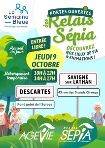Dans le cadre de La Semaine Bleue, venez découvrir les Relais Sépia : des lieux d’accueil temporaire pour personnes âgées, pensés aussi pour offrir du répit aux aidants. 📅 Jeudi 9 octobre 🕒 10h-12h et 14h-17h Descartes – Rond-point de l’Europe Savigné-sur-Lathan – 45 rue des Grands Champs Entrée libre Au programme : ✨ Visite des lieux de vie ✨ Rencontre avec nos équipes ✨ Découverte des animations et temps conviviaux INFOS Un moment pour échanger,…