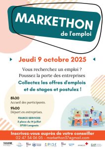 LE JEUDI 9 OCTOBRE 2025 C’EST LE MARKETHON ! Le markethon est une course à l’emploi collective et solidaire, dont le but est de récolter un maximum d’opportunités d’emploi, sur une journée, au bénéfice de tous les participants. L’occasion pour vous d’aller dans les entreprises sur votre territoire. Venez participer à cette action solidaire et aux ateliers de préparation et de candidature qui vous sont proposés près de chez vous. Avec le GRETA CENTRE VAL DE LOIRE, dans…