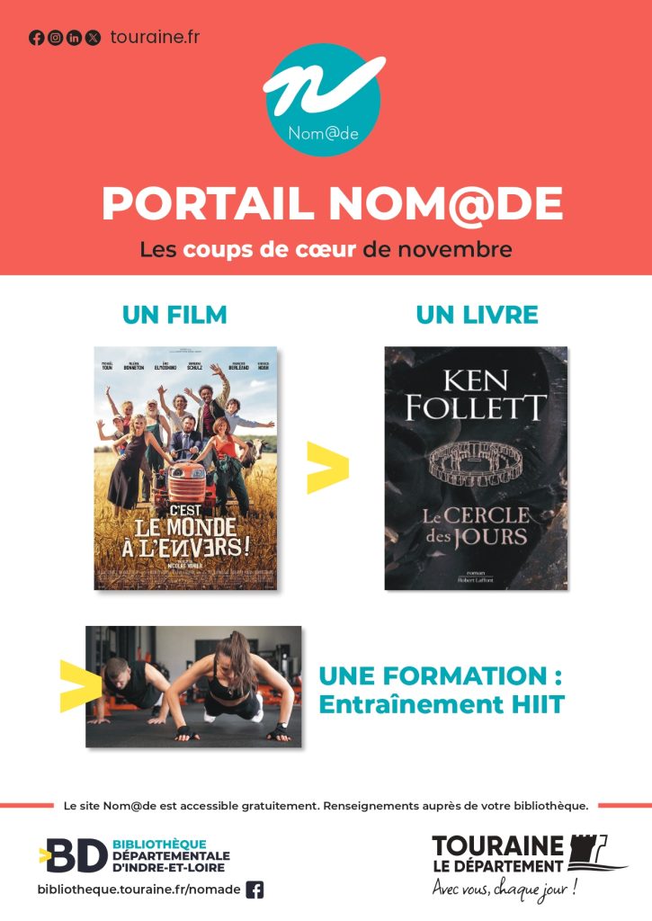 Nom@de permet d’accéder à un ensemble de ressources en ligne (films, livres, formations, recherches à partir du moment où on dispose d’une connexion internet (possibilité smartphones et tablettes)