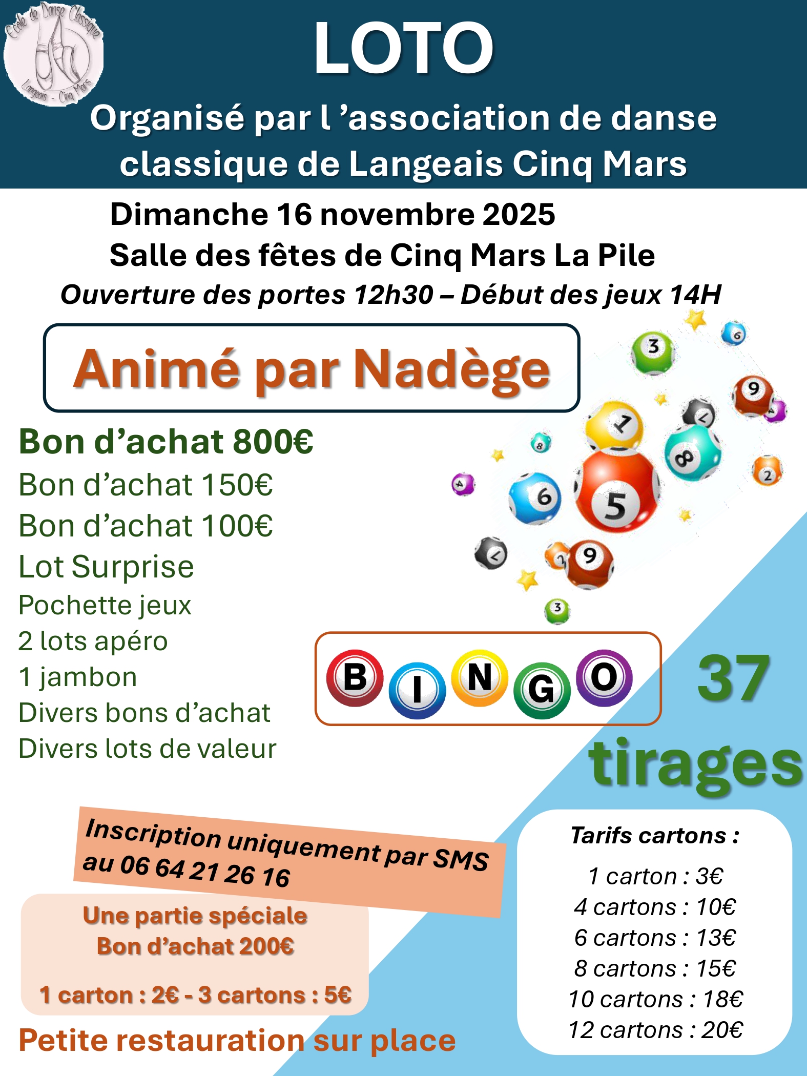 Loto le dimanche 16 novembre dans la salle des fêtes de Cinq-Mars-la-Pile.