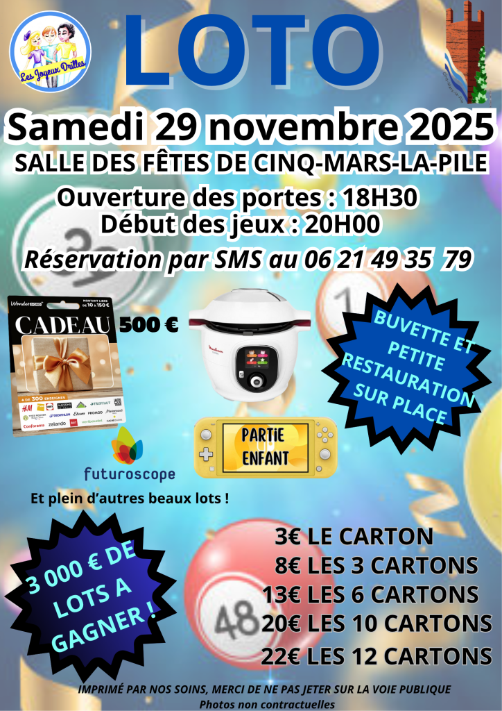 Loto le samedi 18 octobre 2025 dans la salle des fêtes de Cinq-Mars-la-Pile.