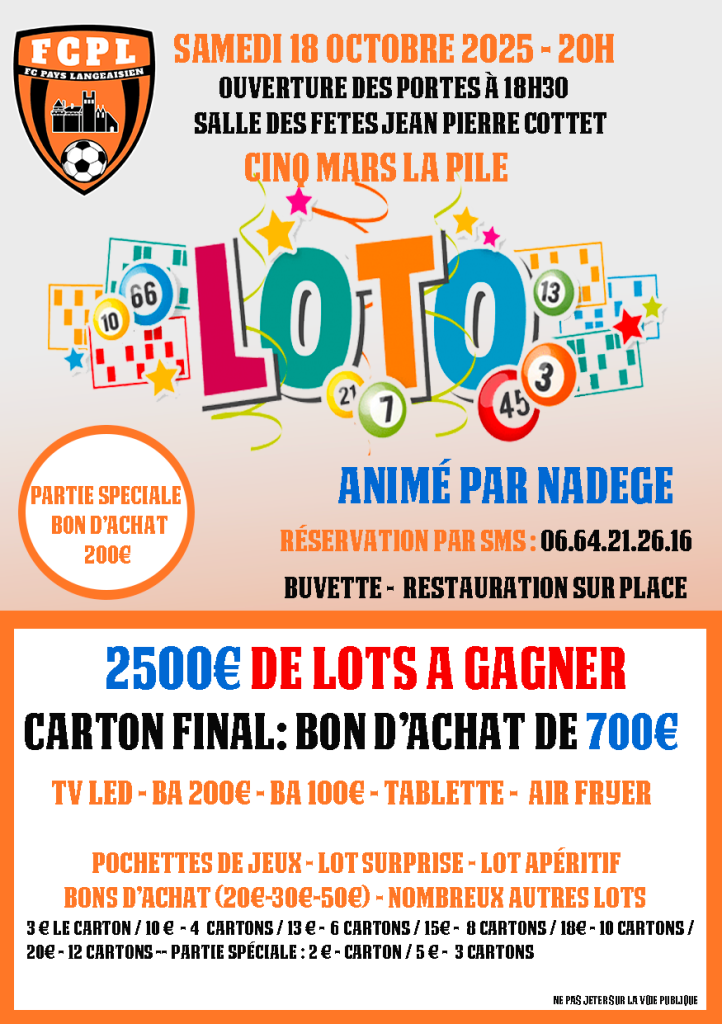 Loto le samedi 11 et dimanche 12 octobre dans la salle des fêtes de Cinq-Mars-la-Pile.