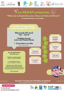 Cette année, le 𝗥𝗘𝗔𝗔𝗣 vous propose un 𝗽𝗮𝗿𝗰𝗼𝘂𝗿𝘀 𝗱’𝗮𝗰𝘁𝗶𝗼𝗻𝘀 pour toutes les familles ! 𝗣𝗿𝗼𝗰𝗵𝗮𝗶𝗻 𝗿𝗲𝗻𝗱𝗲𝘇-𝘃𝗼𝘂𝘀 : 𝗖𝗼𝗻𝗳𝗹𝗶𝘁𝘀 𝗲𝘁 𝗼𝗽𝗽𝗼𝘀𝗶𝘁𝗶𝗼𝗻 : 𝗰𝗼𝗺𝗺𝗲𝗻𝘁 𝗴𝗮𝗿𝗱𝗲𝗿 𝗹𝗲 𝗹𝗶𝗲𝗻 𝗠𝗲𝗿𝗰𝗿𝗲𝗱𝗶 𝟮𝟵 𝗮𝘃𝗿𝗶𝗹 𝗱𝗲 𝟭𝟴𝗵 𝗮̀ 𝟮𝟬𝗵𝟭𝟱 𝗖𝗶𝗻𝗾-𝗠𝗮𝗿𝘀-𝗹𝗮-𝗣𝗶𝗹𝗲 (salle des fêtes) 𝗧𝗵𝗲́𝗮̂𝘁𝗿𝗲 𝗳𝗼𝗿𝘂𝗺 avec Les Passes Rêves 𝗨𝗻 𝗺𝗼𝗺𝗲𝗻𝘁 𝗰𝗼𝗻𝘃𝗶𝘃𝗶𝗮𝗹 𝗽𝗼𝘂𝗿 : 𝗘́𝗰𝗵𝗮𝗻𝗴𝗲𝗿 𝘀𝘂𝗿 𝗹𝗲𝘀 𝘀𝗶𝘁𝘂𝗮𝘁𝗶𝗼𝗻𝘀 𝗱𝗲 𝗰𝗼𝗻𝗳𝗹𝗶𝘁 𝗠𝗶𝗲𝘂𝘅 𝗰𝗼𝗺𝗽𝗿𝗲𝗻𝗱𝗿𝗲 𝗹𝗲𝘀 𝗿𝗲́𝗮𝗰𝘁𝗶𝗼𝗻𝘀 𝗱𝗲 𝗰𝗵𝗮𝗰𝘂𝗻 𝗧𝗿𝗼𝘂𝘃𝗲𝗿 𝗱𝗲𝘀 𝗽𝗶𝘀𝘁𝗲𝘀 𝗽𝗼𝘂𝗿 𝗽𝗿𝗲́𝘀𝗲𝗿𝘃𝗲𝗿 𝗹𝗲 𝗹𝗶𝗲𝗻 Un 𝗮𝗰𝗰𝘂𝗲𝗶𝗹 𝗴𝗿𝗮𝘁𝘂𝗶𝘁 𝗱𝗲́𝗱𝗶𝗲́ 𝗮̀ 𝘁𝗼𝘂𝘀 𝗹𝗲𝘀 𝗲𝗻𝗳𝗮𝗻𝘁𝘀 est proposé Venez…
