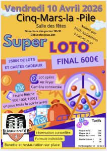 Loto le vendredi 10 avril 2026 dans la salle des fêtes de Cinq-Mars-la-Pile. Ouverture des portes à 18h30 et début des jeux à 20h00. DE NOMBREUX CADEAUX A GAGNER ! Buvette et restauration sur place