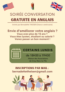 Envie d'améliorer votre anglais ? Vous avez plus de 15 ans ? Vous êtes lycéen, étudiant ou salarié ? Venez passer un bon moment à la Maison des Associations ! Animé par Bernadette THEISEN (franco-américaine) Prochaines dates : 11 mai 22 juin 7 et 21 septembre 5 et 19 octobre Inscriptions par mail : bernadettetheisen@gmail.com