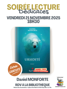 La "Pile de Livres" (bibliothèque) vous convie à sa nouvelle soirée lecture tout public à la bibliothèque ce vendredi 21 novembre 2025 à 18h30. Entrée gratuite. Pour cette occasion, Daniel MONFORTE vous présentera son livre " Ursidité ".
