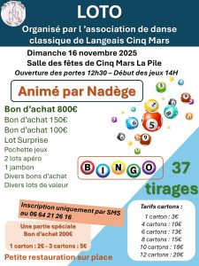 L'APE Les Joyeux Drilles organise au profit de tous les élèves des écoles de Cinq Mars la Pile, un loto le samedi 29 novembre. Tous les bénéfices seront reversés aux écoles de Cinq Mars la Pile afin de participer aux sorties scolaires des élèves, aux projets d'école, etc. Le loto ouvrira ses portes à 18h30 et les jeux débuteront dès 20h. Une buvette et une petite restauration seront proposées sur place ! Les lots sont de qualité et pour…